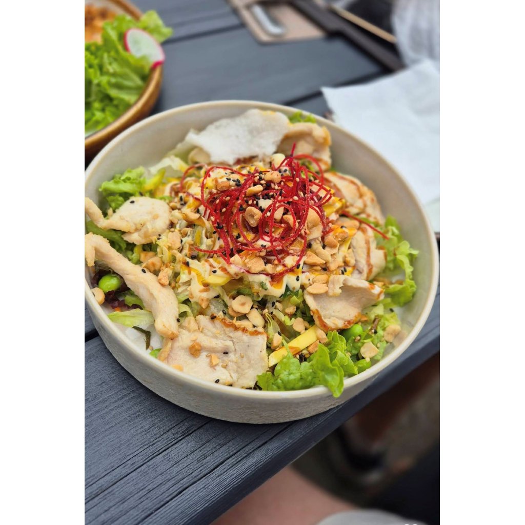 Hatze salát s grilovaným kuřecím - Mango, okurka, červená řepa, červená paprika, salát, edamame, arašídy, krevetový chips, dresink, kuřecí maso