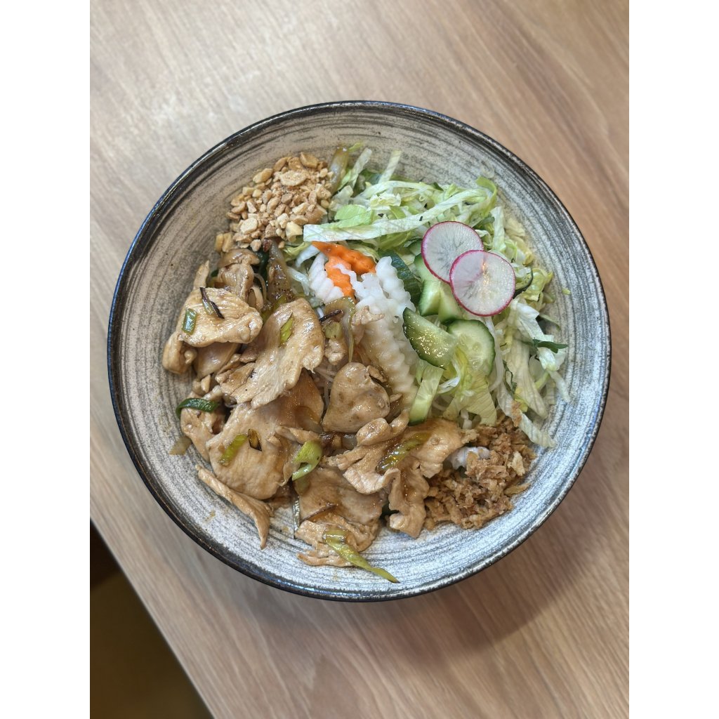 Rýžové nudle s restovaným kuřecím masem, arašídy, smaženou cibulkou, zeleninou a nuoc cham zálivkou