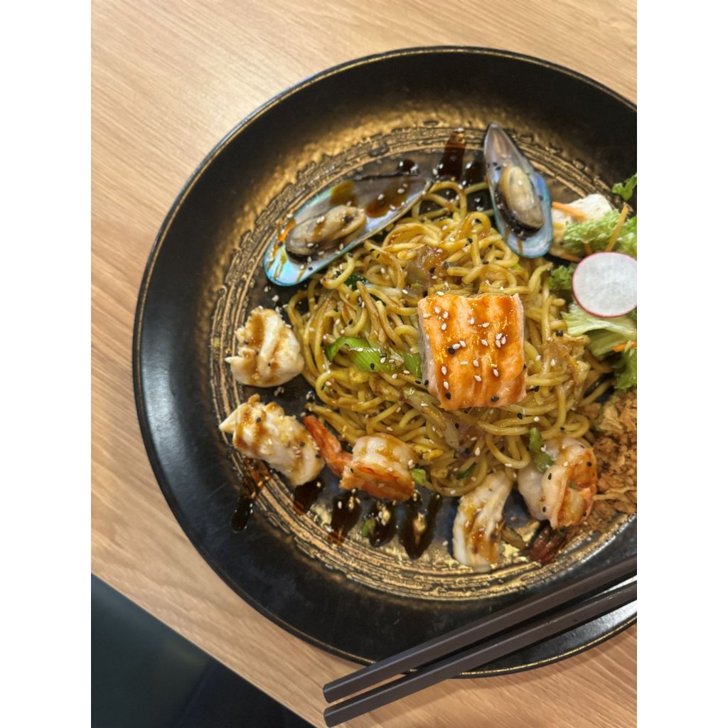 Mi xao mořské plody - Grilované mořské plody s restovanými nudlemi a houbovou omáčkou