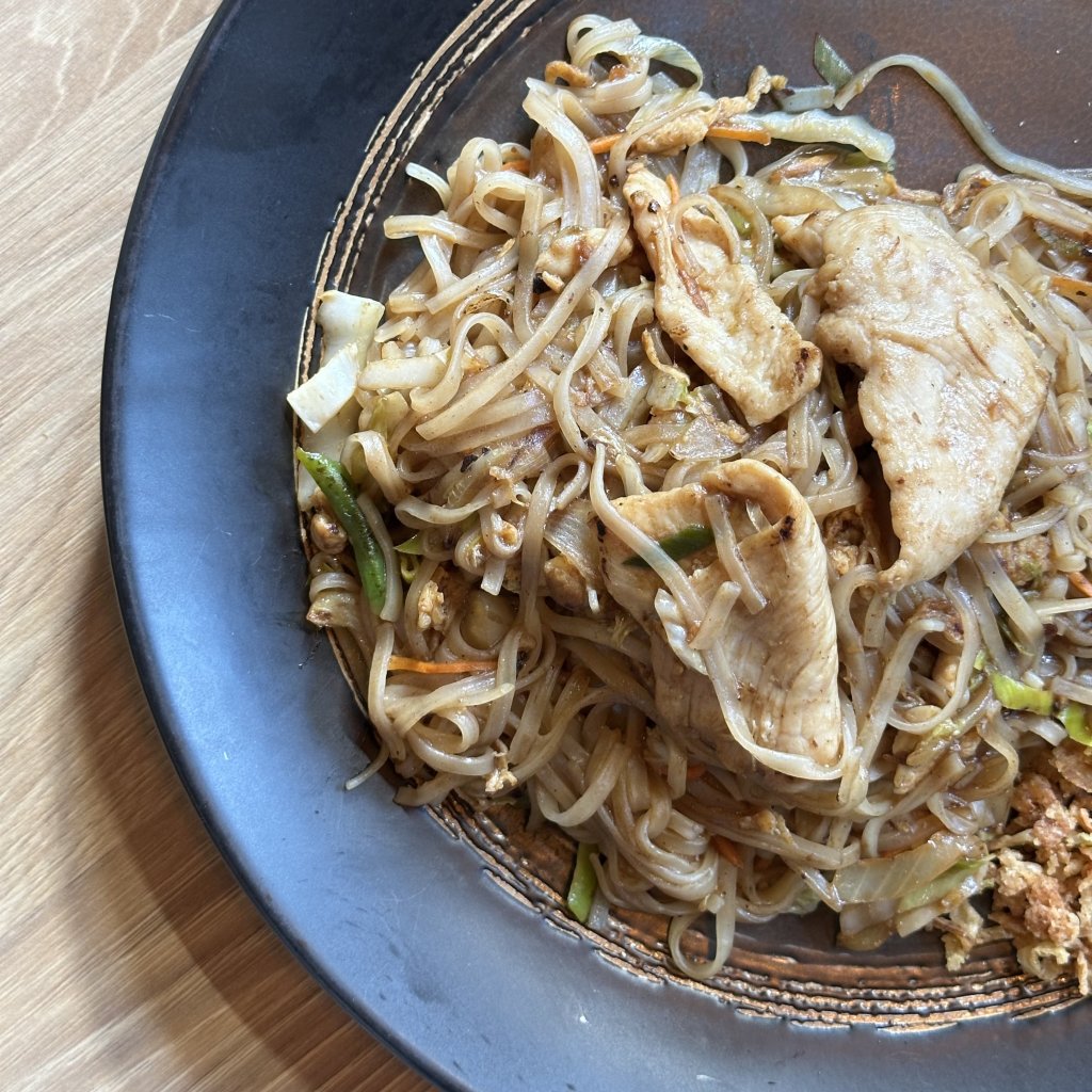 Pad Thai kuřecí - Restované rýžové nudle s kuřecím, arašídy, smaženou cibulkou, chilli, limetkou