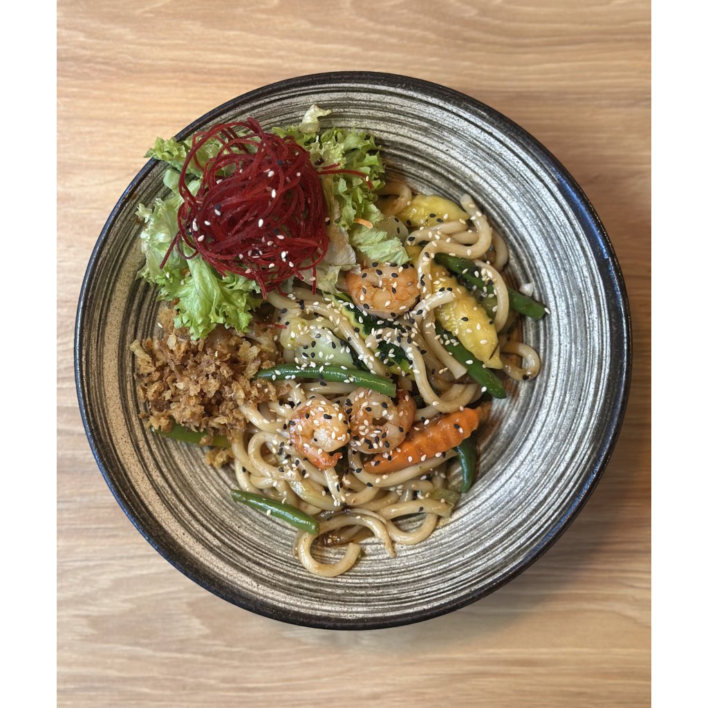 Udon krevety - Restované udon nudle s krevetami, zeleninou, smažená cibulka, sezam