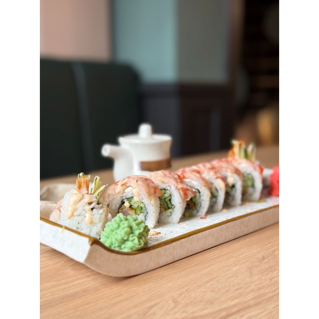Tempura kreveta, okurka, na vrchu grilované krevety, pikantní majonéza - 8 ks