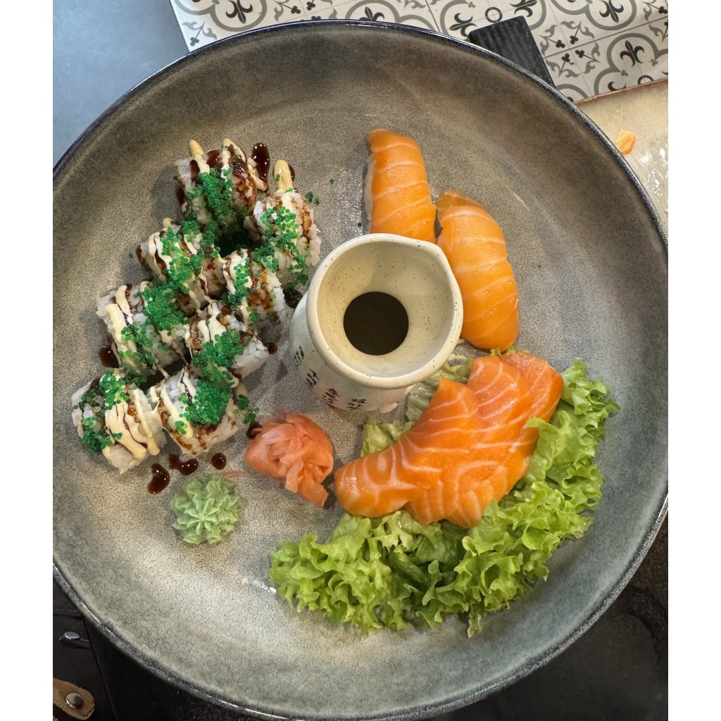 Sashimi losos 3 ks, nigiri losos 2 ks, Alaska rolka 8 ks