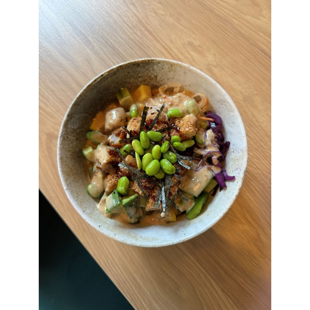 Rýže, krevety v tempuře, paprika, okurka, nakládaná ředkev a mrkev, sojové boby, červené zelí, sezamový dresink, unagi omáčka