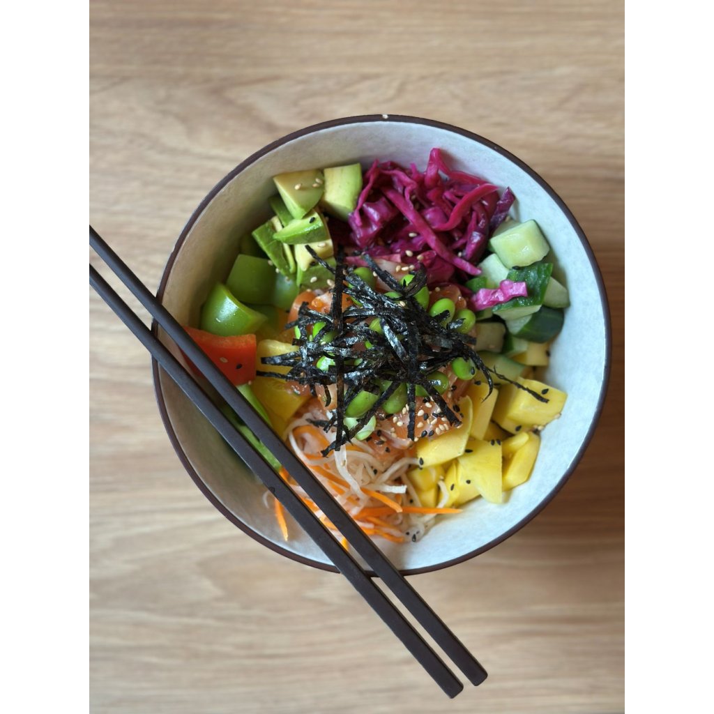 Rýže, avokádo, paprika, okurka, nakládaná ředkev a mrkev, sojové boby, červené zelí, sezamový dresink