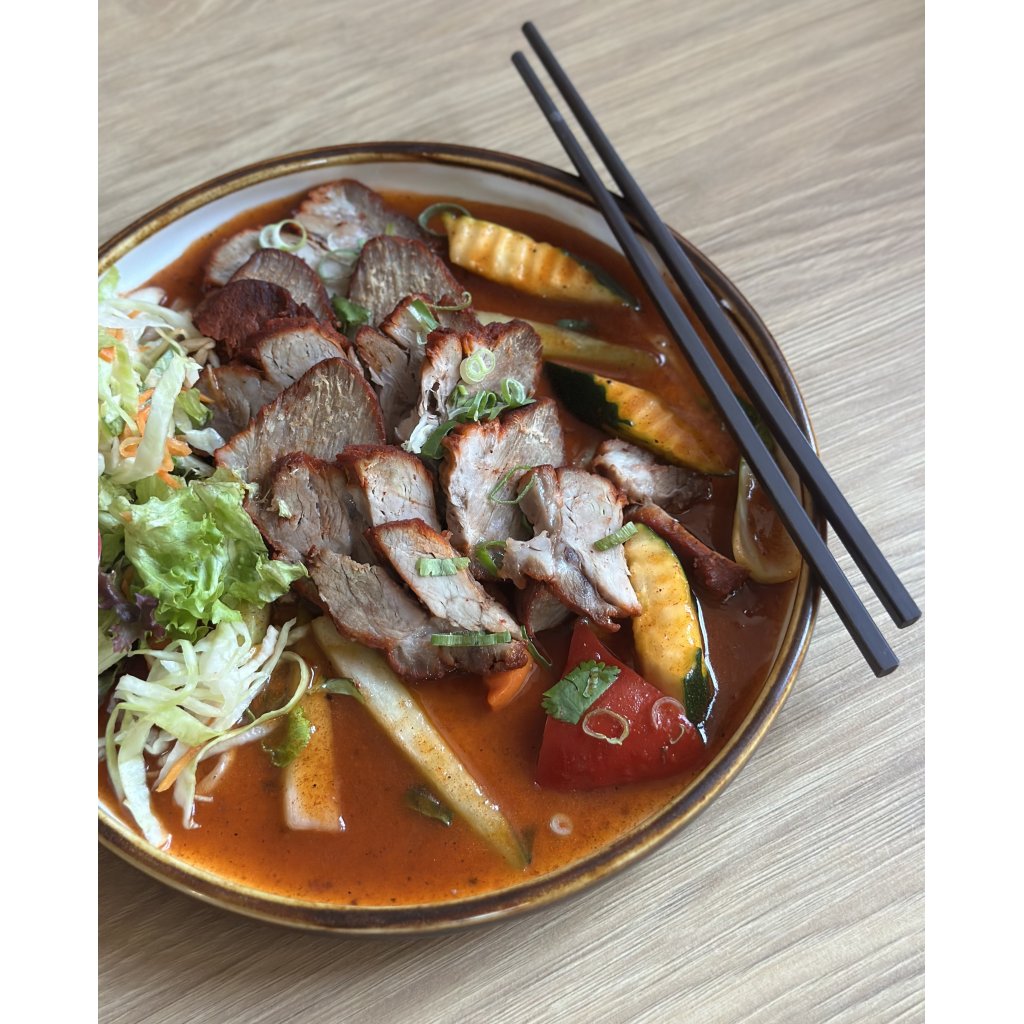 Kantonské BBQ vepřové maso ve sladko-kyselé marinádě, zelný salát