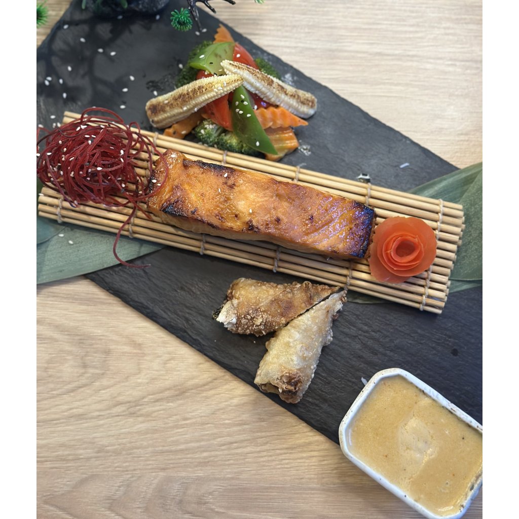 Grilovaný losos s miso glazurou, grilovaná zelenina, jarní závitek, salát