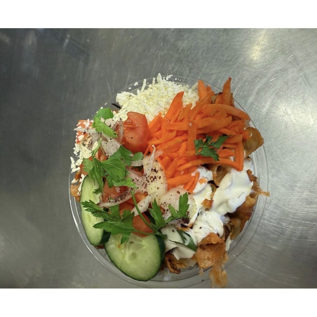 Maso, sýr, ledový salát, zelí, cibule, dresink.