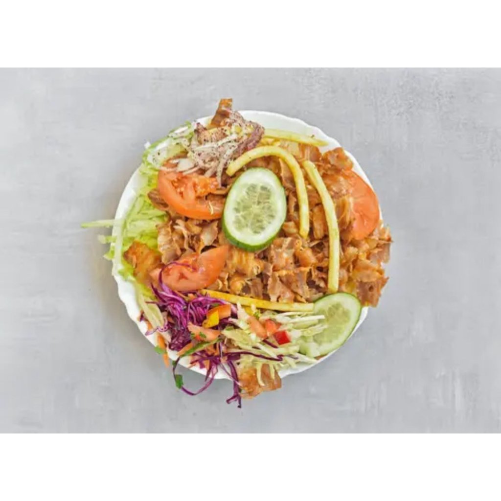Maso, hranolky, ledový salát, zelí, cibule, dresink.