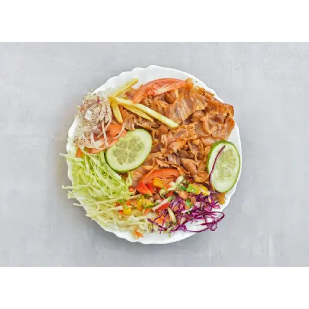 Maso, hranolky, ledový salát, zelí, cibule, dresink.