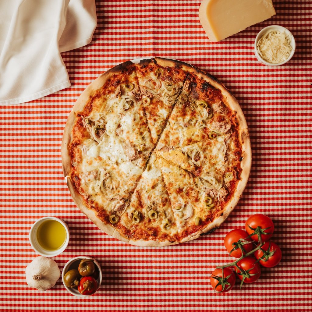 tomato, mozzarella, tuňák, cibule, olivy, vařené vejce