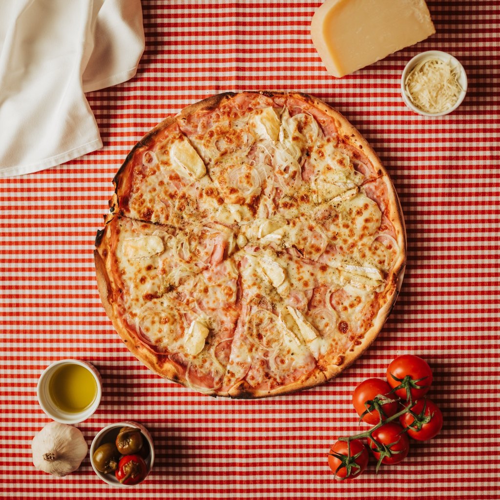 tomato, mozzarella, prosciutto cotto, česnek, hermelín, cibule