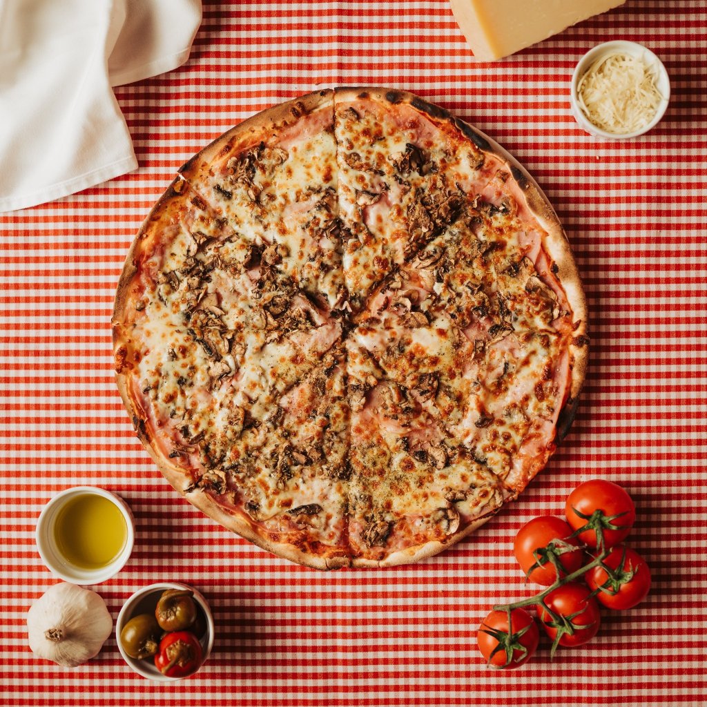 tomato, mozzarella, prosciutto cotto, žampiony, oregano