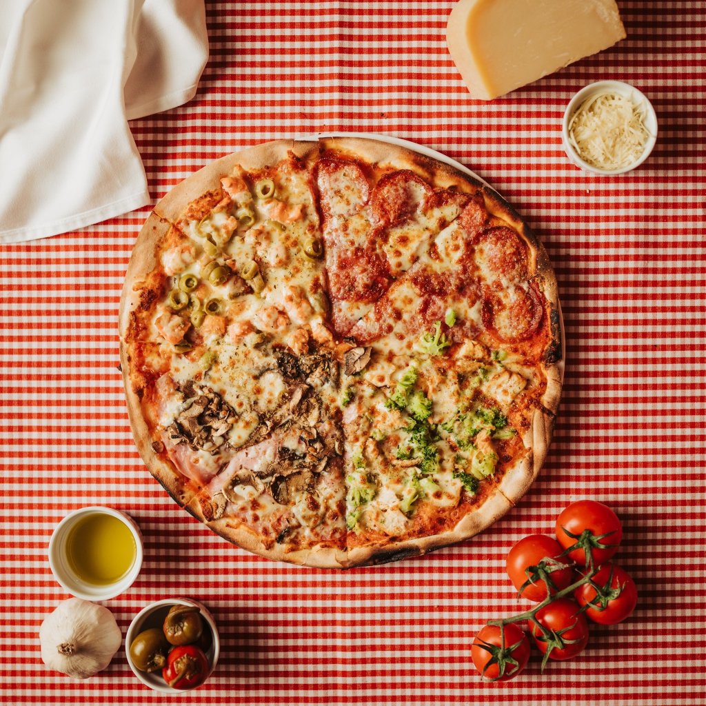 tomato, mozzarella, prosciutto cotto, kuřecí maso, žampiony, brokolice, poličan, čerstvý losos, olivy
