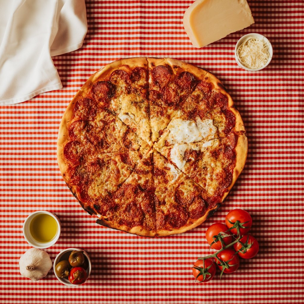 tomato, mozzarella, paprikový salám, vařené vejce, chilli
