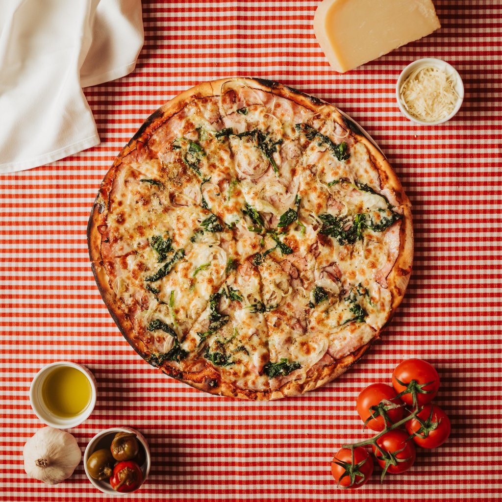 tomato, mozzarella, slanina, listový špenát, cibule, česnek