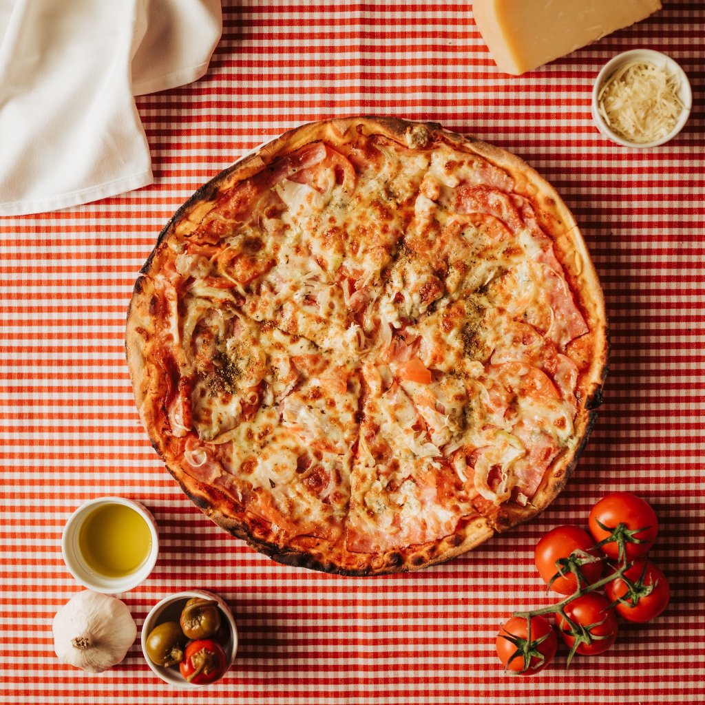 tomato, mozzarella, niva, anglická slanina, suchý salám, feferonky, cibule, čerstvá rajčata