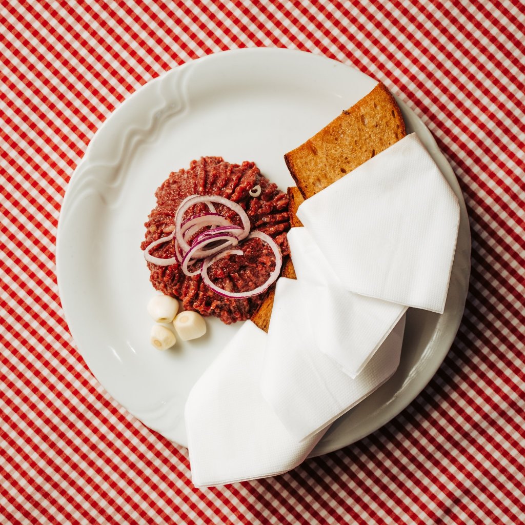 Hovězí tatarák z pravé svíčkové, topinky (4ks)